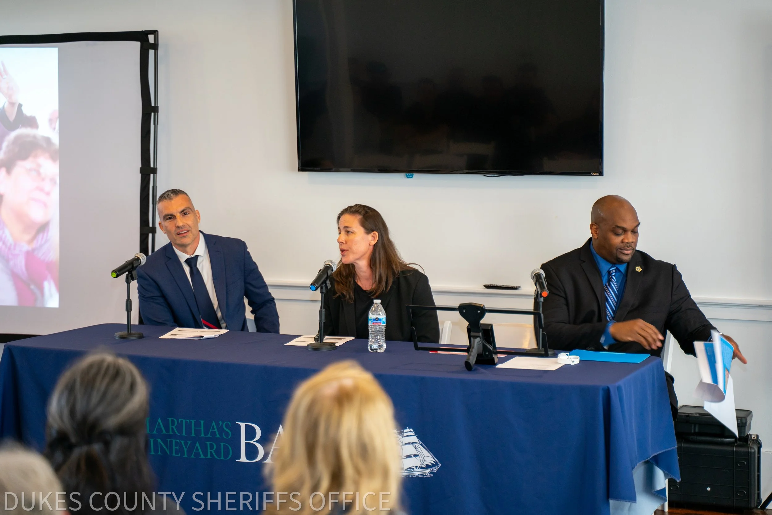 DUKES COUNTY – Dukes County Sheriff’s Office would like to thank all of those who participated in the Elder Abuse Awareness Seminar on Monday, May 19th, collaboratively hosted by Dukes County Sheriff’s Office and Martha’s Vineyard Bank, focused on elder abuse prevention and response through community connection, education, and access to valuable tools. The event was held in the Old Whaling Church in Edgartown, bringing together members of the public, community members, local law enforcement, and elder advocacy organizations. Presenters included Dukes County Sheriff’s Office Director of Community Outreach Sterling Bishop, as well as Federal Bureau of Investigation Special Agents.